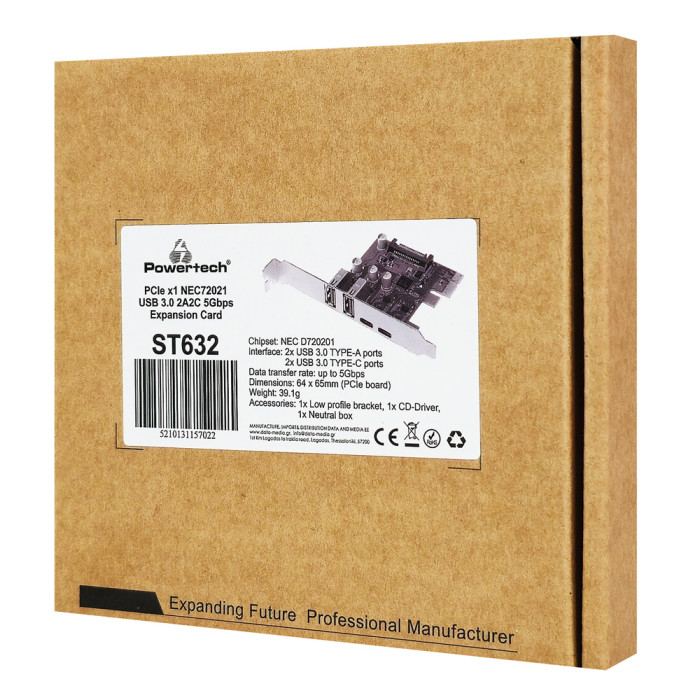 POWERTECH κάρτα επέκτασης PCIe σε 2x USB & 2x USB-C ST632, 5Gbps, NEC D720201