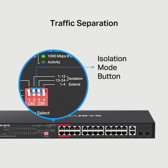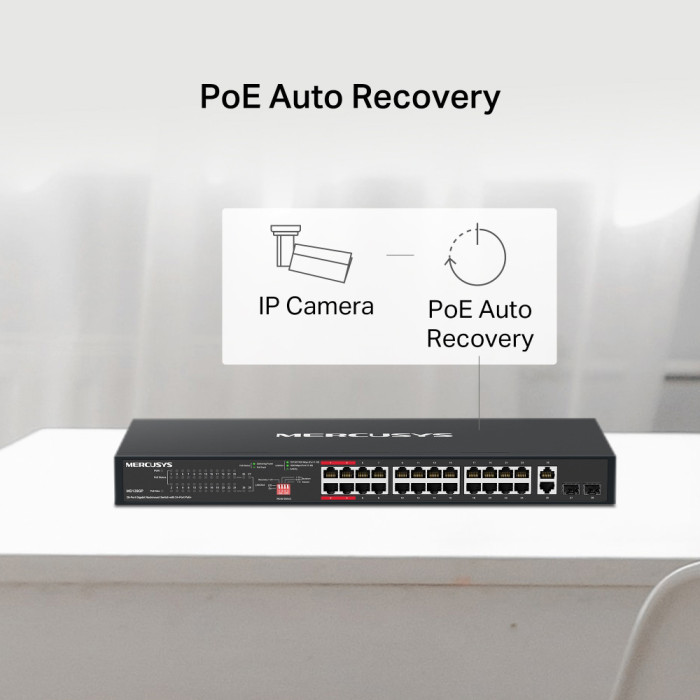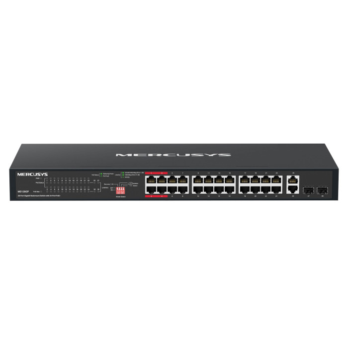 Το rackmount switch της Mercusys σας επιτρέπει να επεκτείνετε το ενσύρματο δίκτυο σας με 24x Gigabit PoE+ θύρες, 2x uplink Gigabit θύρες και 2x SFP υποδοχές.