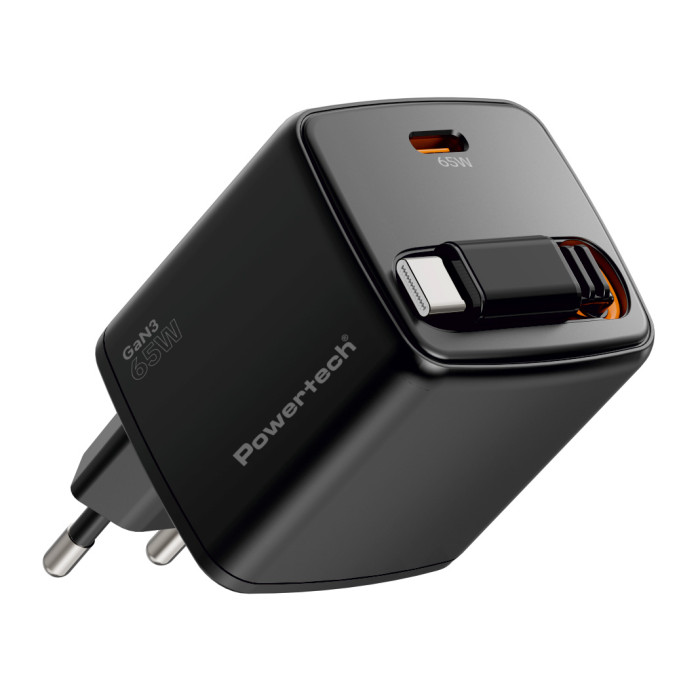 POWERTECH φορτιστής τοίχου PT-1573 με πτυσσόμενο καλώδιο, USB-C, 65W, GaN, μαύρος