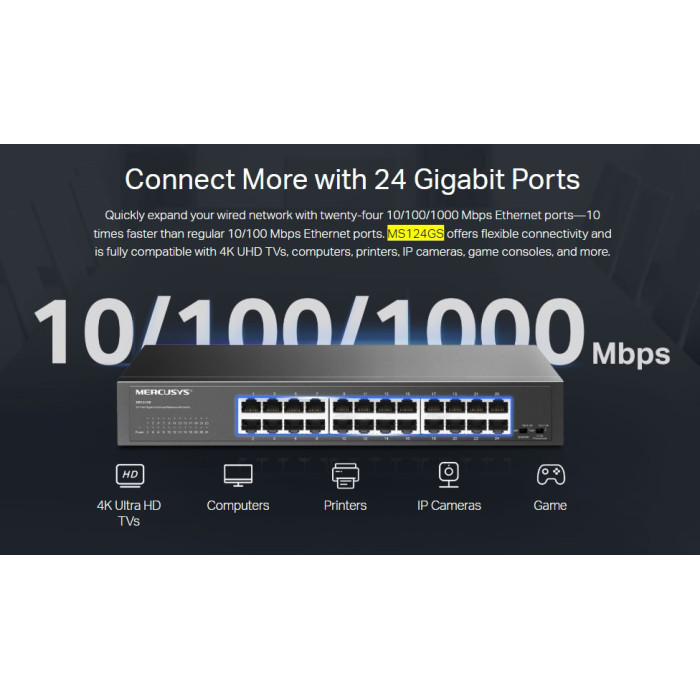 Το desktop/rackmount switch της Mercusys σας επιτρέπει να επεκτείνετε το ενσύρματο δίκτυο σας με 24x Gigabit θύρες.
