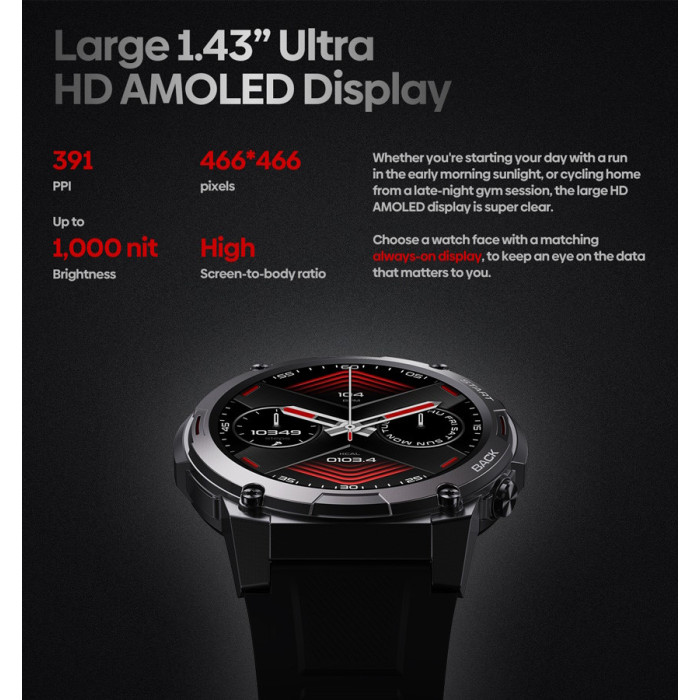 Εξοπλίζεται με εντυπωσιακή έγχρωμη οθόνη αφής 1.43" AMOLED που προσφέρει την δυνατότητα να έχετε την οθόνη του smartwatch πάντα ενεργοποιημένη.