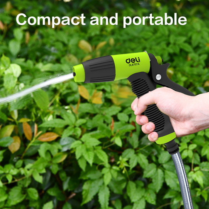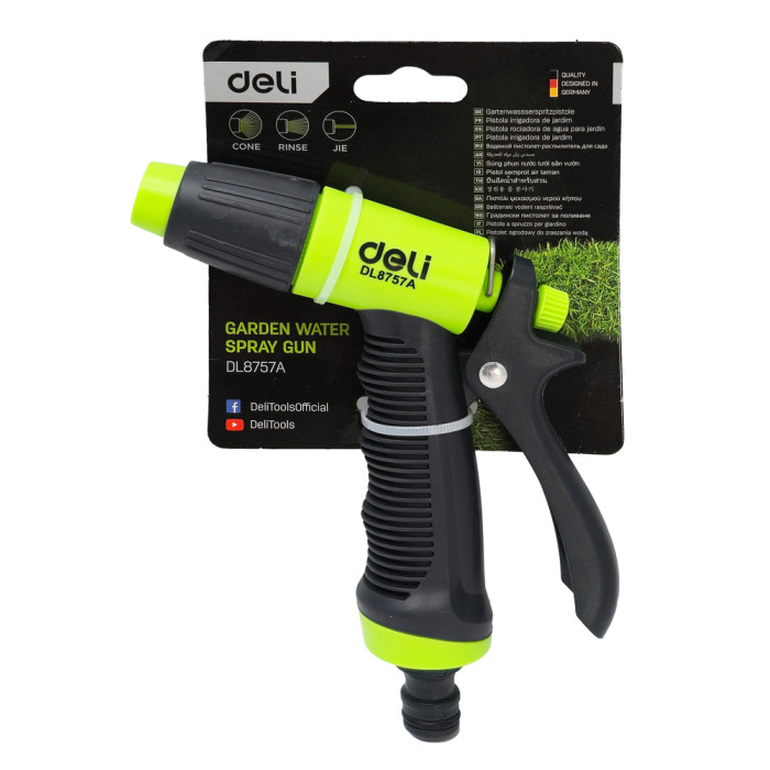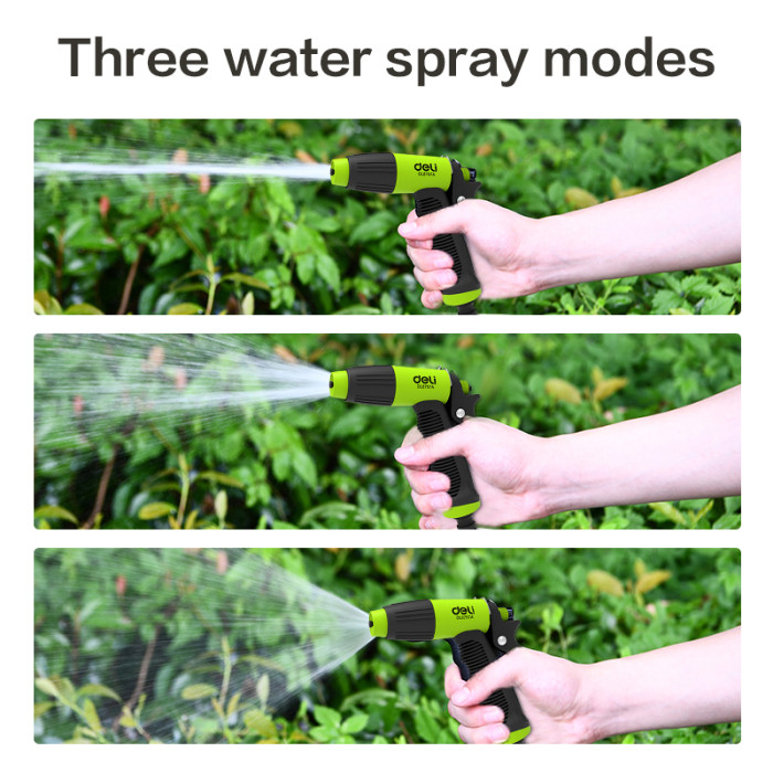 Πιστόλι εκτόξευσης νερού της Deli ιδανικό για εύκολο και αποτελεσματικό πότισμα. Διαθέτει 3 λειτουργίες ψεκασμού, προσφέροντας ευελιξία για διαφορετικές εφαρμογές ενώ η αντιολισθητική λαβή του εφαρμόζει καλά στο χέρι για πιο ξεκούραστο πότισμα.