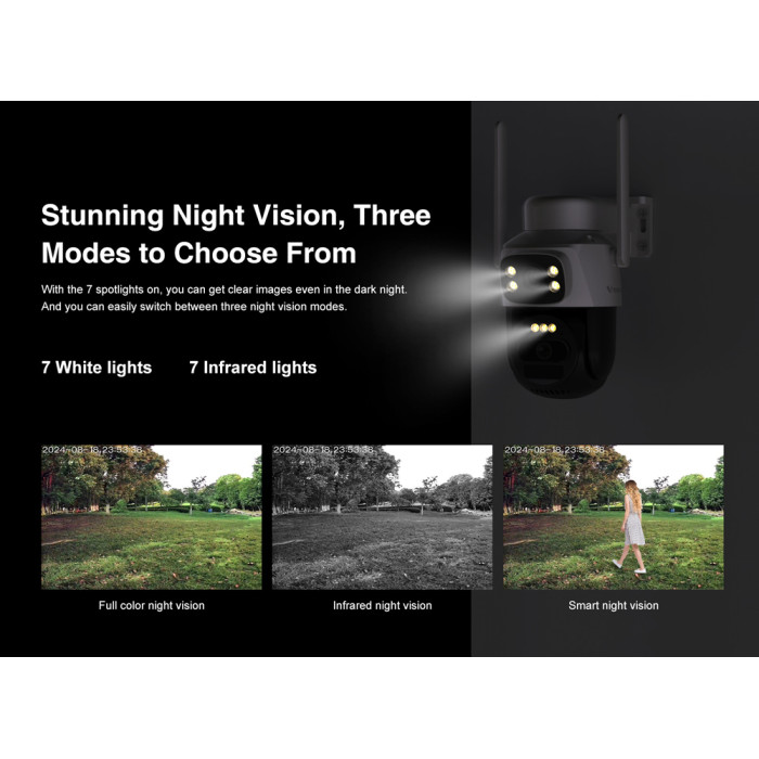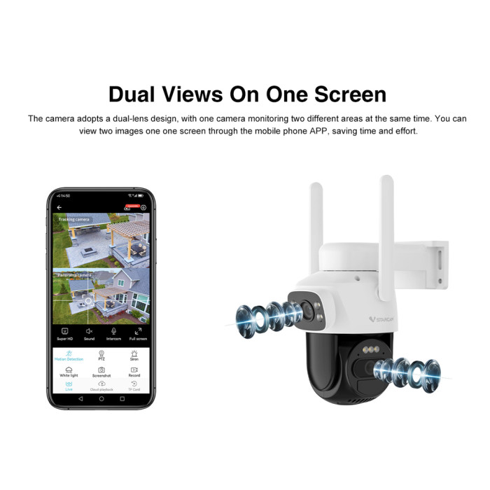 Ενσωματώνει 2 φακούς που επιτρέπουν μεγαλύτερη κάλυψη στον χώρο και υποστηρίζει PTZ λειτουργία που σας επιτρέπει την οριζόντια και κάθετη μετακίνηση της κάμερας μέσω της εφαρμογής.