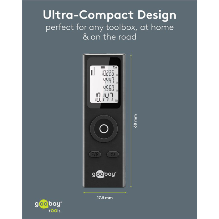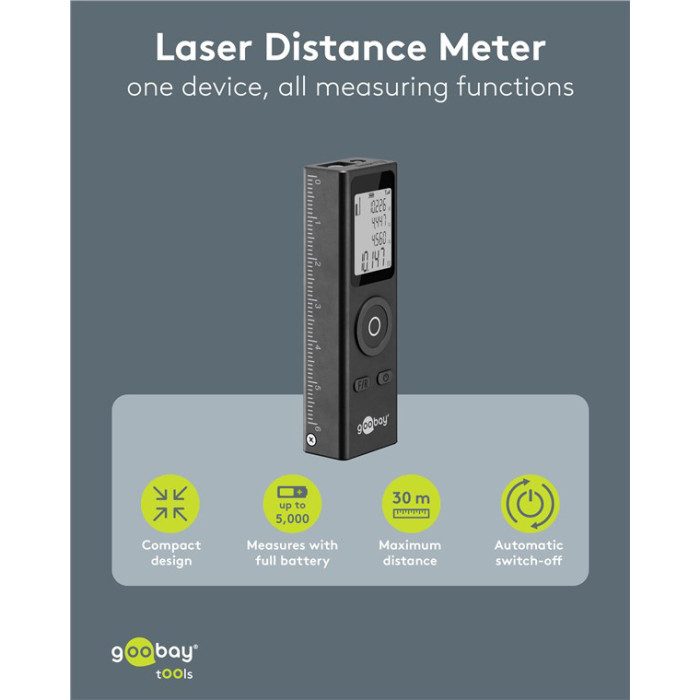 Compact και αξιόπιστος laser μετρητής απόστασης της Goobay, ιδανικός για επαγγελματική και οικιακή χρήση. Με εμβέλεια έως 30 μέτρα, πολλαπλές λειτουργίες μέτρησης και ανθεκτική μεταλλική κατασκευή, προσφέρει ακρίβεια και ευκολία σε κάθε εργασία.