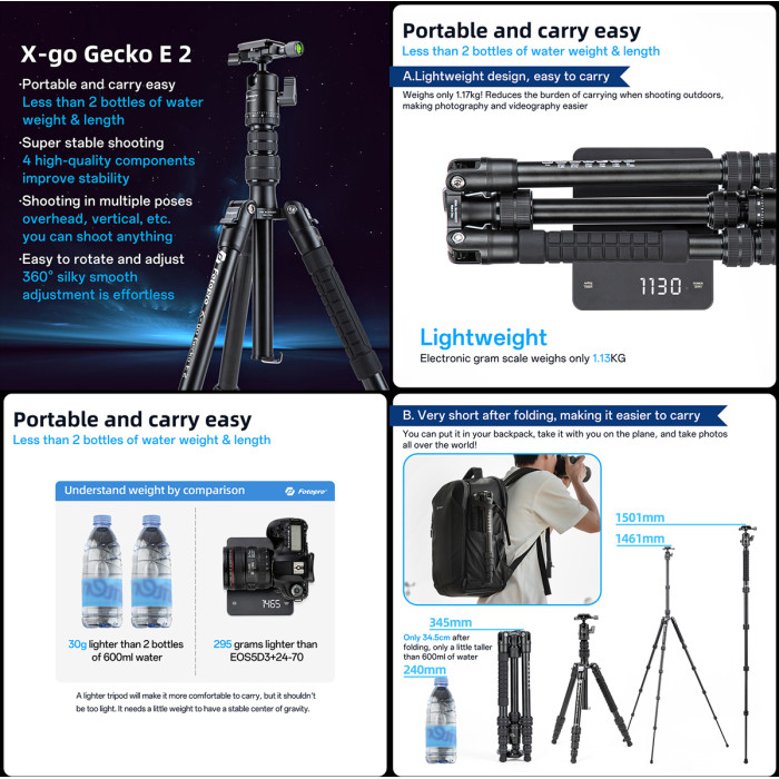 FOTOPRO τρίποδο φωτογράφισης X-go Gecko E2, πτυσσόμενο έως 146.1cm, έως 8kg, μαύρο