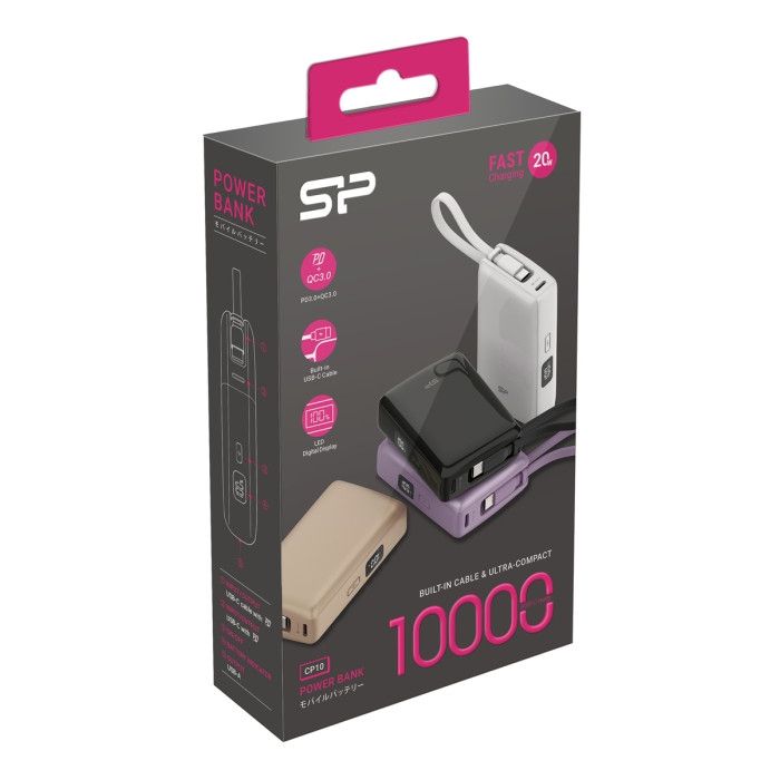 SILICON POWER power bank CP10 με καλώδιο USB-C, 2x θύρες εξόδου, 10000mAh, 20W, μαύρο